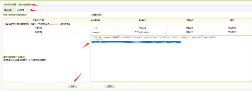 2、在内容模型-普通文章模型(或者其他模型)-字段管理-模型字段配置(文本模式),添加