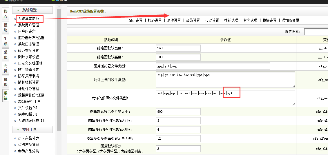 一、首先需要在织梦 系统中添加支持MP4格式如图: