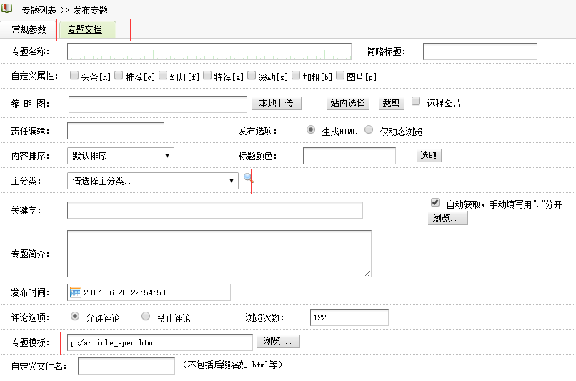 ①选择好主分类,这里像第一种方法一样,新建一个专题栏目,里面专门放专题列表,如果不是单独设置栏目,就选择原来的栏目;