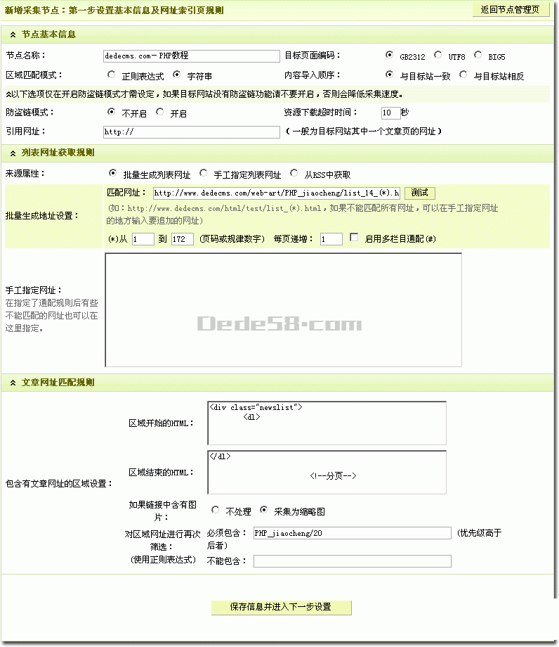 先填写一个方便记忆的节点名称,选择目标页面编码为GB2312,防盗链模式不做设置,因目标站没做限制,这一项就不做修改,系统默认超时时间10秒。