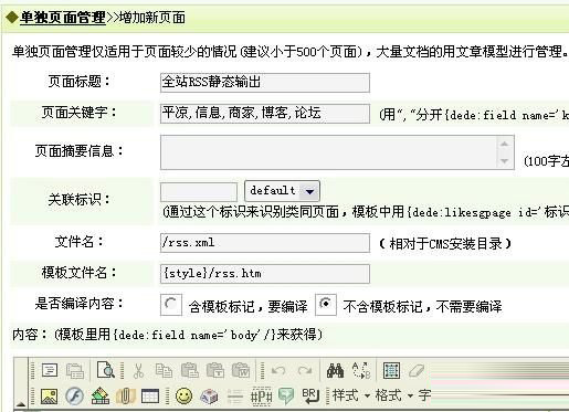 按照上图去建个这样的单页面文件就行了,但是名字不能用“全站RSS静输出” 最好使用英文名字,自已可以随便起的,点一下保存其它的不要管它