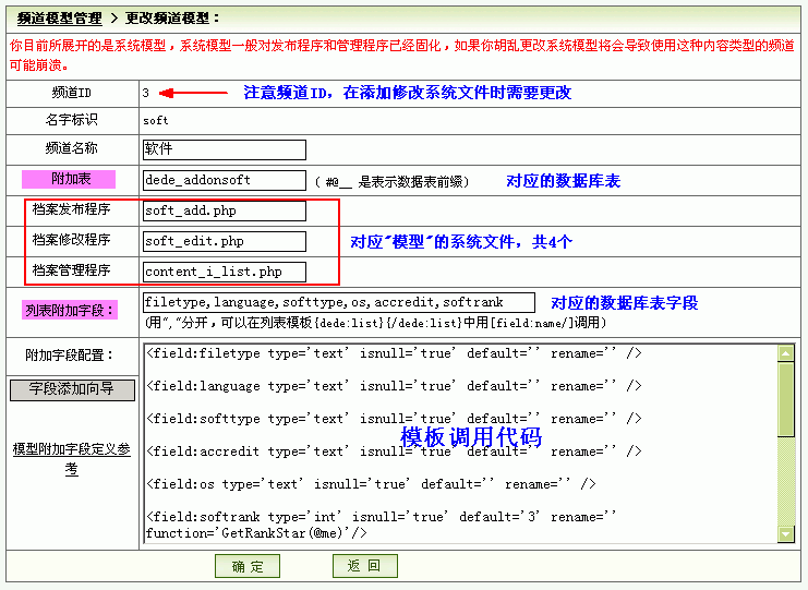 界面里就简单的几行填写表单,里面“附加表”、“列表附加字段:”分别是CMS系统自动创建的“数据库表”、表里的“字段”(注意:dedeCMS有一个共用的表“archives”,各个模型都共用其中的好些字段,所以“软件模型”里的字段并不多):