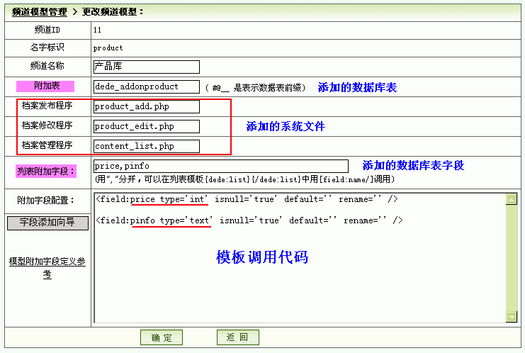 注:dedeCMS有一个公共表“archives”,各个模型都共用其中的字段,新建立的模型也是,也就是说,实际上只需要建立两个字段:price、pinfo