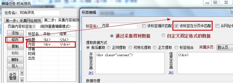 第一步,编辑任务,切换到“采集内容规则”标签,选中“内容”,点击修改,勾选上“该标签在分页中匹配”,很多人没有采集到分页就是因为少了这一步。