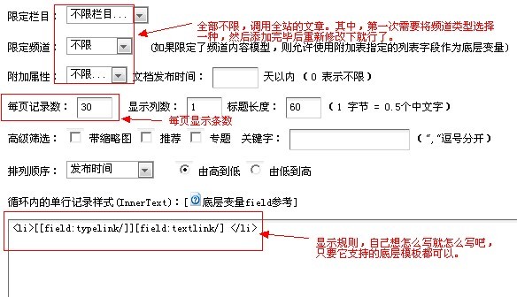 接着我们要在在模板文件中,调用自由列表内容。我们可以使用{dede:freelist/}调用主体内容,同时,使用{dede:pagelist listitem="info,index,end,pre,next,pageno,option" listsize="10"/}进行分页。