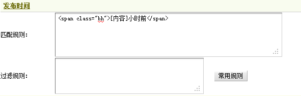 回到图23,可发现有“17小时前”,由此可见,这里采集数字17就可以了。采集规则为“<span class=”bh”>[内容]小时前</span>”。这里不需要使用过滤规则。填写后,如图30所示,