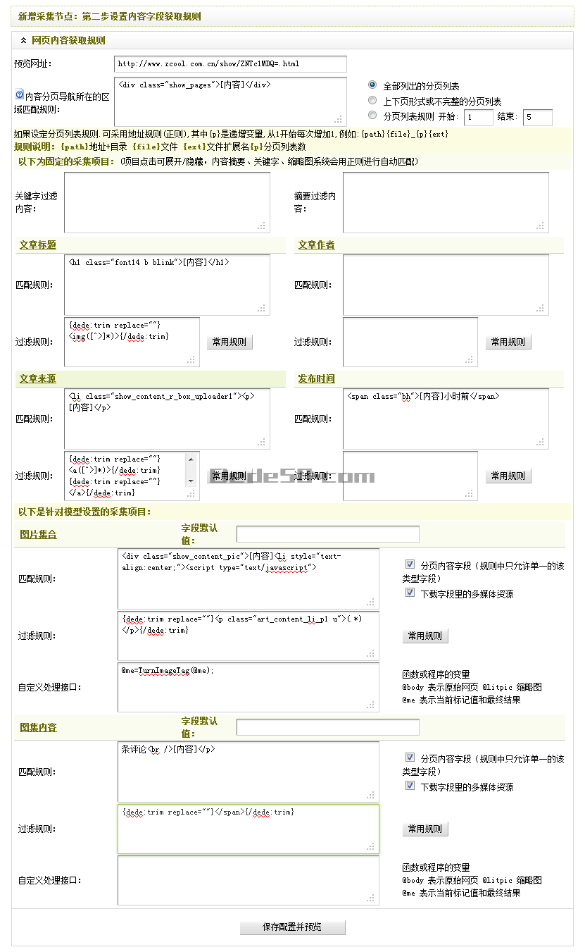 前言:本文是“Dedecms采集功能的使用方法 --- 图片集“的第二节,在前一节的基础上,将会对新增采集节点中的第二步:“设置字段获取规则”部分做一个简单的介绍。为了与前文保持一致,本文将延续使用前文的章节标记。