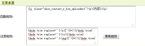 从图28中,可发现上传者的名字介于“<li class="show_content_r_box_uploader1"><p>“和“</p>”之间,因此这里应填写“<li class="show_content_r_box_uploader1"><p>[内容]</p>”作为文章来源的采集规则。虽然,选定的采集规则能采集到上传者的名字,但是同时也包含了所不希望采集到的图片和链接,下面通过设置过滤规则把它们过滤掉。首先,过滤掉链接,这里使用“{dede:trim replace=''}<a([^>]*)>{/dede:trim}{dede:trim replace=’’}</a>{/dede:trim}”;其次,使用“{dede:trim replace=''}<img([^>]*)>{/dede:trim}”过滤掉图片。填写后,如图29所示,