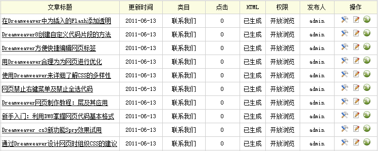 导出采集内容提示“完成所有栏目列表更新”后,单击“浏览栏目”,便可进入网站的相关页面查看到采集到的文章列表及其具体内容。也可在后台管理界面的主菜单中单击“核心”,然后单击“普通文章”,进入“文档列表”页面,查看所采集到的文章列表,如(图41)所示,