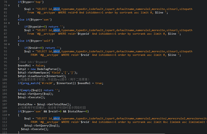打开/include/taglib/channel.lib.php,找到78-94行,可以看到有3条sql数据,分别是 if($type=='top'), if($type=='son') ,if($type=='self');如果需要用子栏目模式,那么在109-115行也需要做出修改,如下图所示: