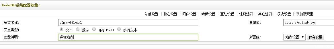 2、在DEDECMS后台新建变量cfg_mobileurl,并赋值为http://m.b nx b.co m