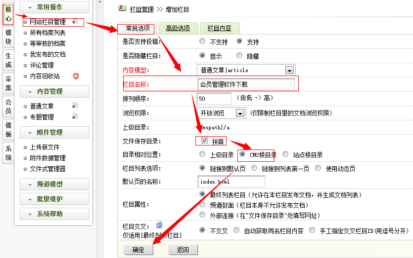 登陆后台-核心-网站栏目管理-常规选项-自己填写“栏目名称”-文件保存目录不填将后面的“拼音”勾选上这样栏目就会以拼音方式出现在URL中-目录相对位置勾选“CMS根目录”这样文章就不会生成在a目录中了(织梦默认是将内容统一放在a目录下的),具体如下图