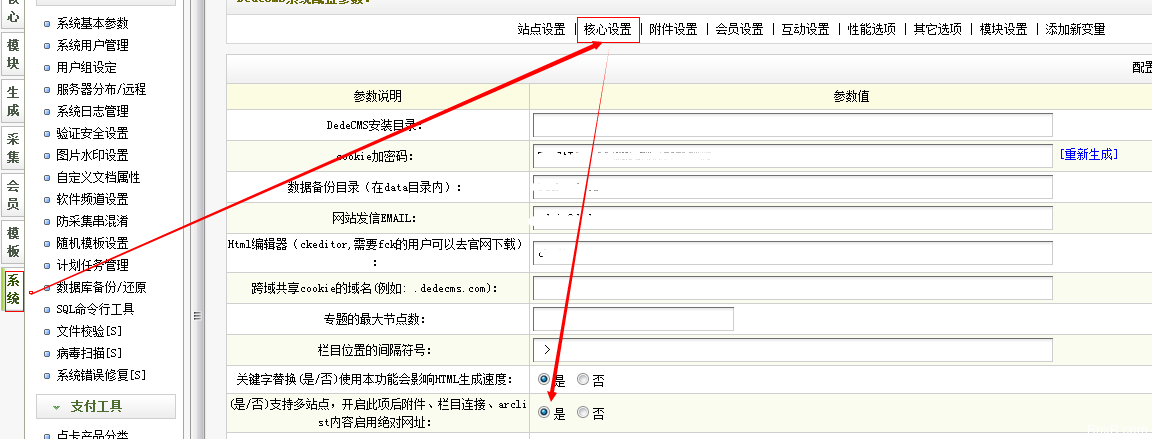 登陆网站后台-点击“系统”-“系统基本参数”-将“(是/否)支持多站点,开启此项后附件、栏目连接、arclist内容启用绝对网址:”勾选上-确认即可 如下图: