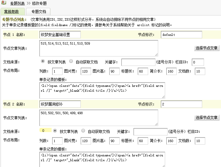 第一个是调用所有的专题,第二个只调用指定标识的文章。