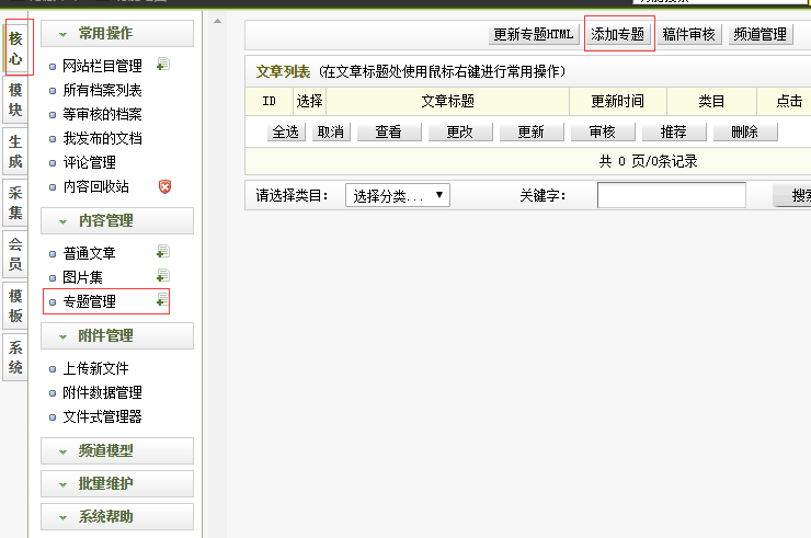 首先我们登录织梦管理后台,在【系统】-【核心】-【专题管理】中对专题进行管理,如下图: