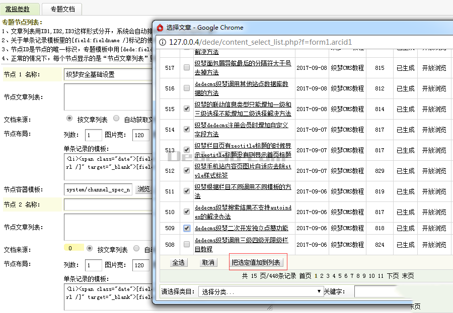 在专题文档添加页面,点击“选择节点文章”,为节点1选择需要添加的文档,如下图: