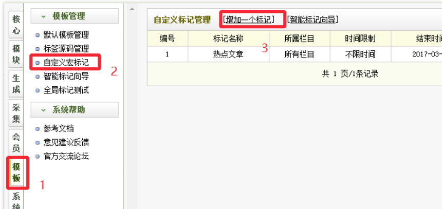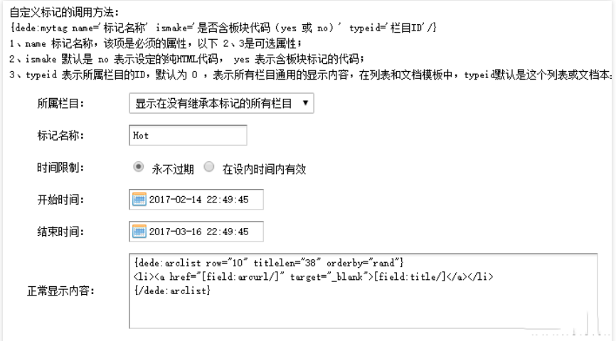 增加名为Hot的标记,在正常显示内容里面填写随机文章通用标签(orderby根据实际情况修改),其他默认即可。