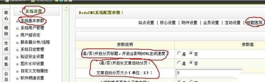 其实也很简单,点击:系统——系统基本参数——性能选项,通过更改前三项来控制自动分页。开启分页标题、开启长文章自动分页、文章自动分页大小。