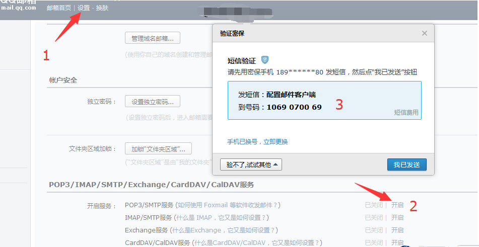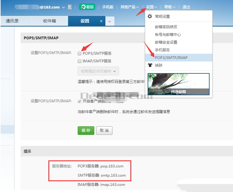 根据自己邮箱开启POP3/IMAP/SMTP,接下来我们来设置后台,认真看下图红色圈着的,一个都不能少