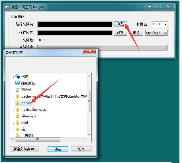 选择整个模板文件夹 -> 选择扩展名为"*.htm" -> 选择保存位置 -> 选择"GBK->UTF" -> 点击"转换"