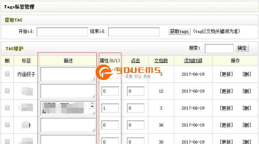 这里的TAG属性可以根据自己的需要填写任意数字,比如属性是0、1。如果你觉得不直观,那就换成a,b,c之类的,只需要修改dede_tagindex数据表addtagtype数据类型为varchar,长度为255即可,方法就不详述了,下面是调用方法。