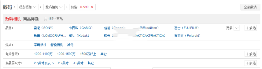 根据实际情况,京东的品牌不属于筛选范围,属于类别。因此只有“分类”、“有效像素”、“液晶屏尺寸”作为品牌类别公共的筛选字段项目。当然还有多选功能,这里就不细说了。