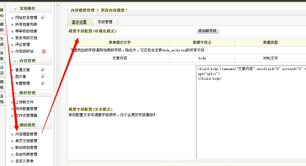 1:打开后台--频道模型--内容模型管理