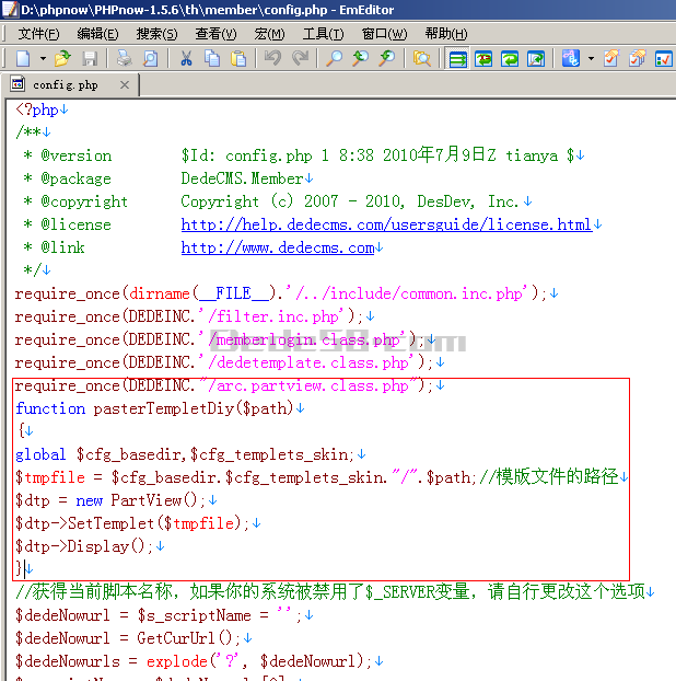 1.找到dedecms会员中心的的目录 member ,然后在目录下用编辑器打开config.php 加入对dede模板解释函数如下: