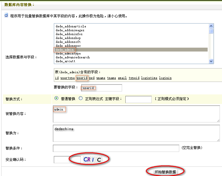 在图-5里,选中dede_admin数据表,接着选择里字段userid,然后把admin替换为了dedechina。
