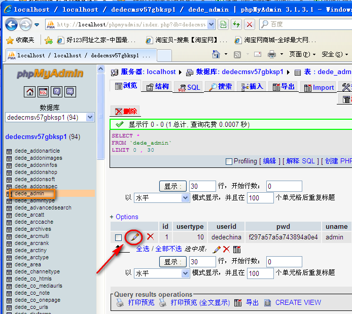 图-7 使用phpmyadmin修改dedecms管理员账号