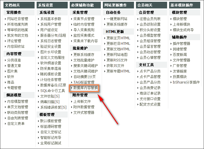 图-4 DedeCMS后台菜单“数据库内容替换”