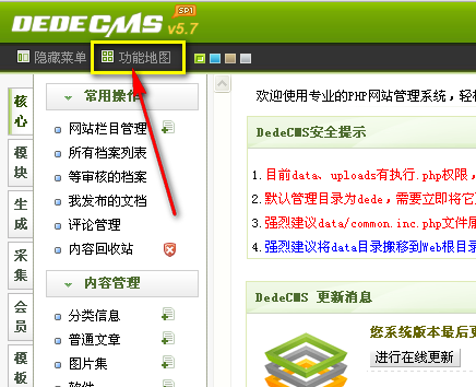 登陆DedeCMS后台之后,单击左上方的“功能地图”,打开图-3界面: