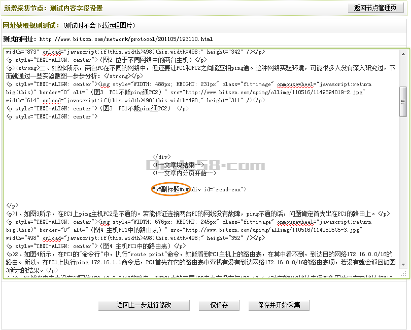 检查无误后,单击“保存配置并预览”。如果之前设置正确,单击后,将会进入“新增采集节点:测试内容字段设置”页面并看到相应的文章内容。如(图27)和(图28)所示,