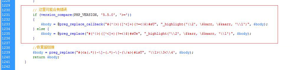 错误文件:include/arc.archives.class.php,织梦在php5.5+中,由于php5.5以后规定preg_replace必须被替换成preg_replace_callback,而开发者只在代码中留下了一句“这里可能会有错误”就不了了之了(事实就是一个错误)