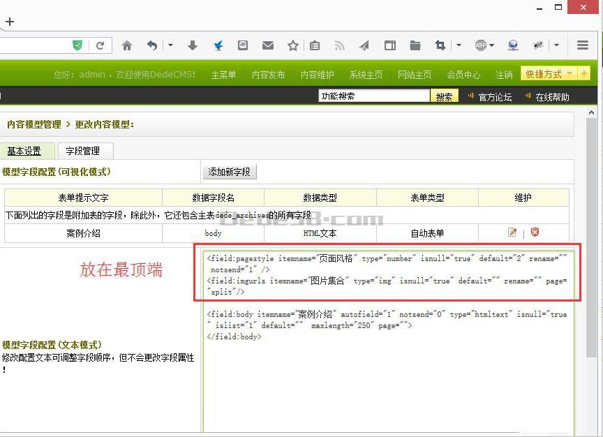 3-1、进入你的某个模型 - 字段管理,在【字段配置】最顶端添加如下代码