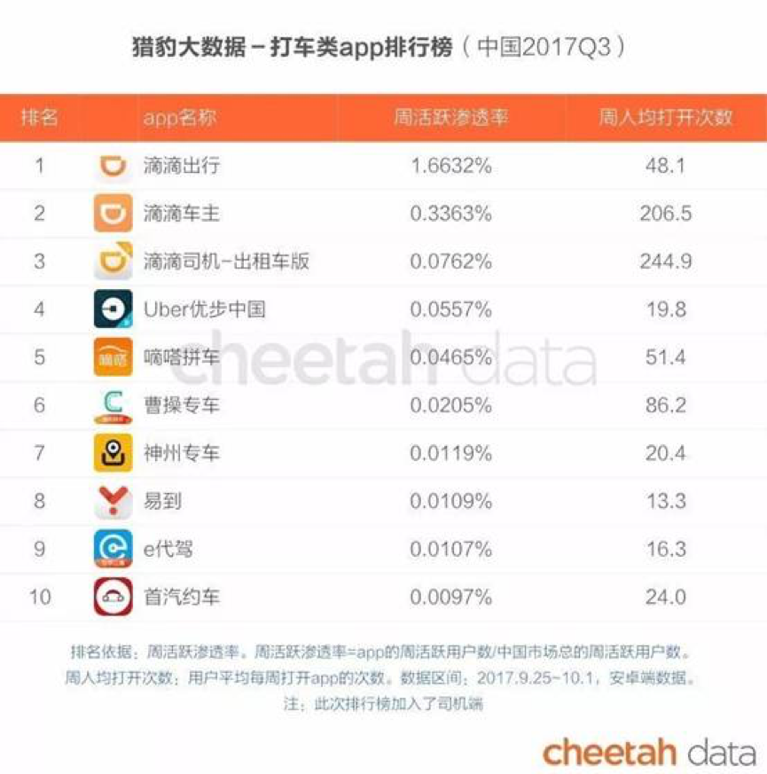 据猎豹大数据在本年Q3 的数据显示,滴滴系已占据打车类APP排行榜的前 4 名,仅滴滴出行周活跃渗透率,就已远超嘀嗒拼车、曹操专车、首汽约车等企业数据的总和。