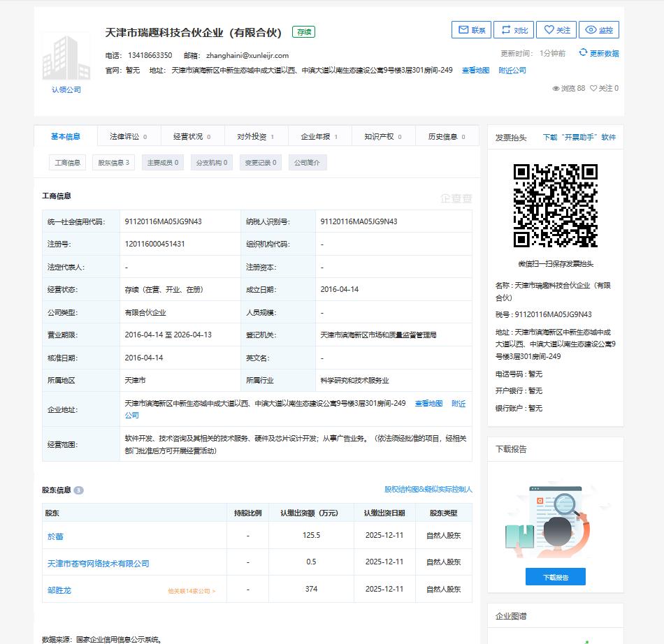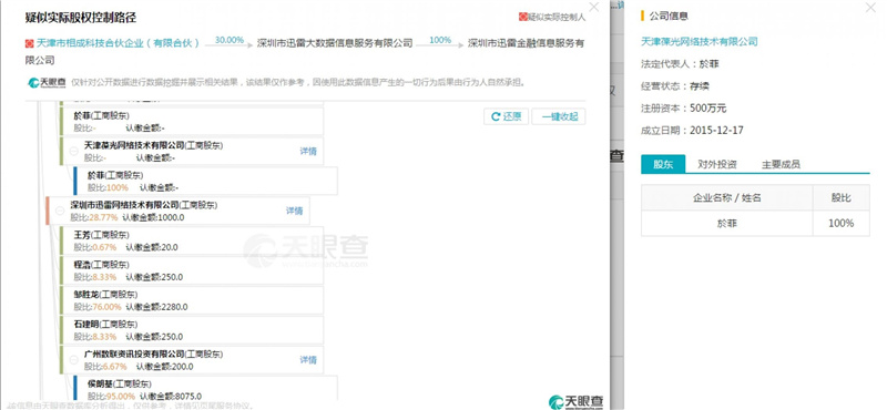 而按照公开资料,相关利益企业天津市相成科技合伙企业(有限合伙)的最大股东是於菲,於菲个人持股达到66.67%,不只如此,该合伙企业的GP天津葆光网络技术有限公司也是於菲100%控股的企业,即天津市相成科技合伙企业(有限合伙)持有的30%迅雷大数据公司投票权均由於菲实际控制。