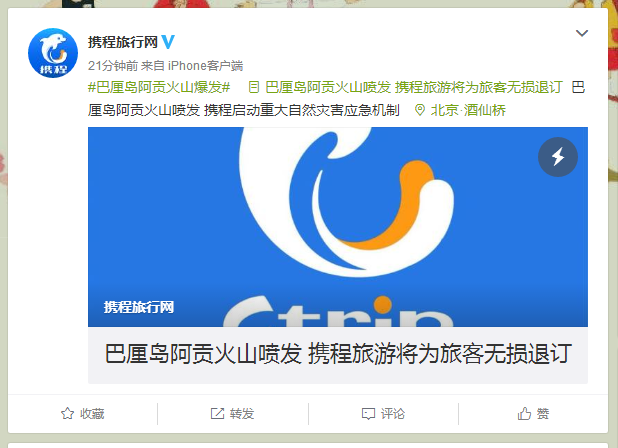 携程旅游第一时间启动重大自然灾害应急机制,确认本地情况及游客安适。据了解,由于阿贡火山距离巴厘岛主要旅游地登巴萨及库塔区域都有较远距离( 60 公里以上),旅客全部安适。