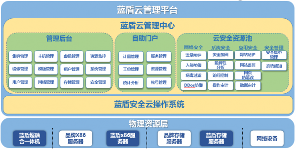 蓝盾云平台由蓝盾云办理平台和物理资源层共同构成。