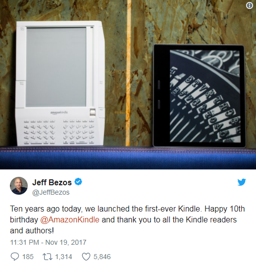 亚马逊总裁Jeff Bezos发推特祝贺Kindle十周年