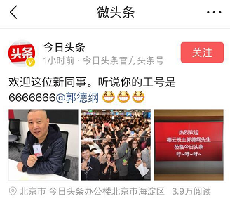 不但如此,郭德纲入职今日头条后,他们可以在内容上进行进一步的而合作,好比今日头条为德云社提供平台,可以征集相声段子,可以做定制的脱口秀节目,甚至都可以举办相声大会。在这背后,郭德纲的德云社可以继续发展壮大。社团的业务也可以多线程发展,弟子们不仅单可以上节目,在今日头条也可以做短视频进行传播,甚至可以快速成为红人。而今日头条则可以聚焦相声类型的内容,更加专业,更具影响力。难得的是,以此为例还可以进行其他类型项目的深度挖掘,好比传统手艺人、民间高手等差别职业、身份的艺人都可以在今日头条上得到传播,同时还能间接促进文化的传承。