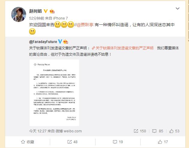 贾跃亭转发了声明微博,并配文称,有一种情怀叫造谣,让有的人深深迷恋其中。有趣的是,钛媒体创始人赵何娟转发了贾跃亭的微博,并回怼:“欢迎回国来告”。