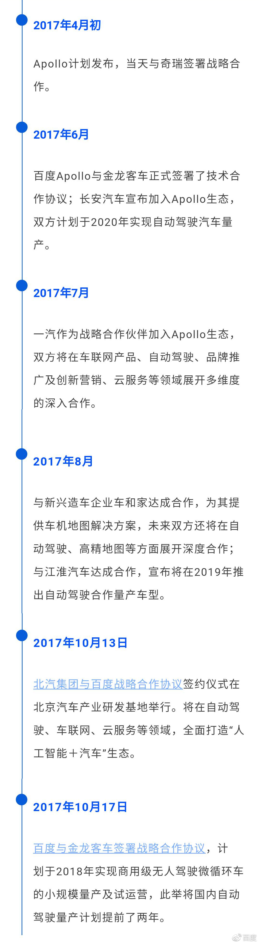 值得一提的是,百度Apollo已经与众多企业达成了合作,包孕北汽集团、金龙客车、一汽等都签订了合作协议。