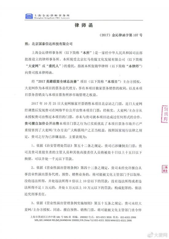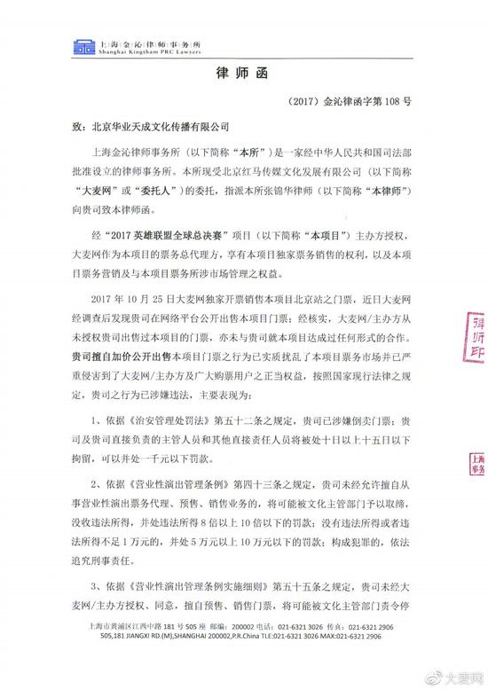10 月 26 日晚间,大麦网发布声明称,大麦内部已确认无任何违规操作,而票牛、有票等二手票交易平台的销售行为,大麦网不知情也不认同。目前甚至还有一些公然冒用大麦名义、或利用与大麦相同的公司地址混淆用户认知,加价进行销售,对大麦品牌造成侵害。并附上了两封律师函。