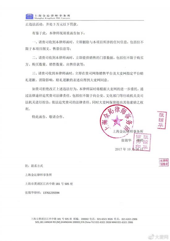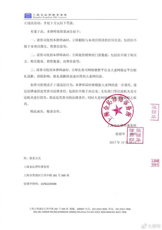 我们已经向涉嫌捏造票务来源、哄抬票价的销售主体发送了律师函,将会通过法律手段要求其下架相关项目并停止对大麦的名誉侵害。