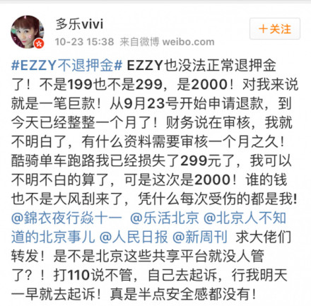 有用户发布微博称,从 9 月 23 号开始申请退款,到今天已经整整一个月了也没有退换押金,财务一直在推脱说是在审核。