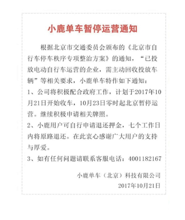 10 月 21 日,共享单车小鹿发布公告,公司计划将于 10 月 23 日零时起北京暂停运营,小鹿用户可自行申请退还押金, 7 个工作日之内押金将原路退还。