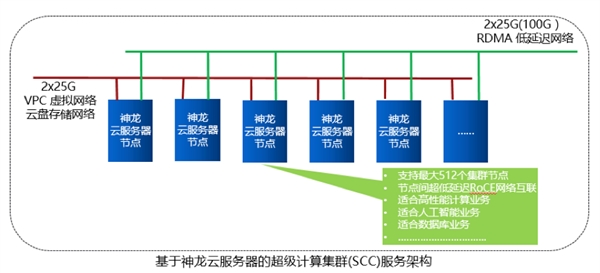 针对高性能计算,阿里云还将推出基于神龙云办事器的超级计算集群(SuperComputer Cluster),各节点之间采用高带宽低延迟的RDMA网络互联,RoCE网络速度媲美Infiniband。