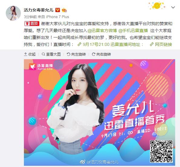 在微博中,姜允儿还预告了在迅雷直播首秀的时间 9 月 17 日晚上 9 点。