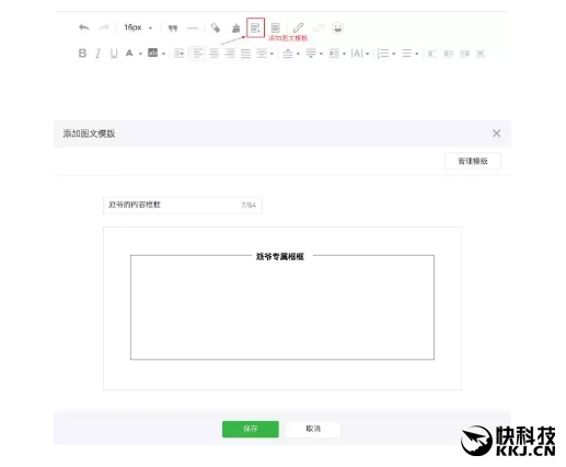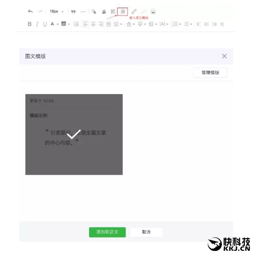 而在编纂图文素材时,可以直接插入使用已保藏的模版。